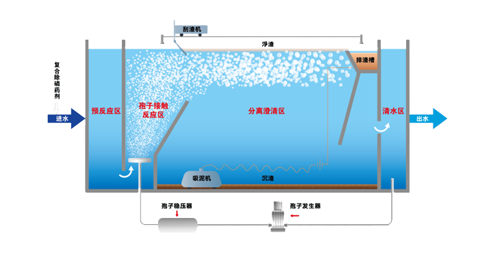 孢子轉(zhuǎn)移技術(shù),是將混凝技術(shù)、氣浮技術(shù)與微納米孢子相結(jié)合,通過定制化藥劑、微納米氣泡與水中的磷、疏水基懸浮物發(fā)生反應(yīng),創(chuàng)新形成的一種高效物理化學(xué)處理方法。主要解決了目前常用溶氣氣浮技術(shù)在應(yīng)用過程中存在的處理效率較差、表面負(fù)荷較低、處理能耗較高、應(yīng)急機(jī)動性不強等問題。